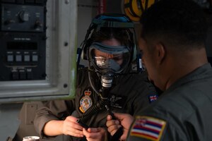 Royal Australian Air Force Corporal Felicity Hull, Number 36 Squadron loadmaster, inspects flight equipment with U.S. Air Force Tech Sgt. Jose Molestina, 204th Airlift Squadron loadmaster, during Joint Pacific Multinational Readiness Center 25-01 on Joint Base Elemendorf-Richardson, Alaska, Oct. 7,